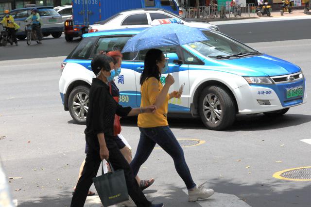 ▲遮陽傘、太陽帽成了市民出行必備之物。