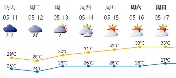 5月11日陰天,氣溫25-29℃,有陣雨或雷陣雨,伴有短時陣風7級左右。12日有雷陣雨,局部大雨,局部有短時強降雨;13日陣雨轉多云;14-17日多云到晴天,天氣再趨悶熱。