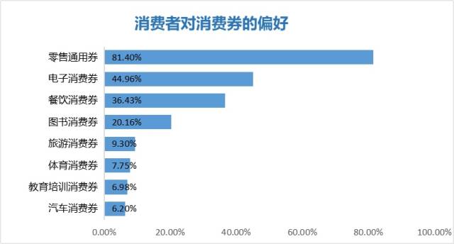 調(diào)研發(fā)現(xiàn),消費(fèi)券對(duì)于促進(jìn)消費(fèi)有較大作用。42%的消費(fèi)者希望拿到消費(fèi)券,47%的消費(fèi)者持中立態(tài)度,但表示如果得到了消費(fèi)券的話更愿意主動(dòng)去消費(fèi)。在各種類(lèi)型的消費(fèi)券中,消費(fèi)者喜歡的前三種類(lèi)型分別是零售通用券、電子消費(fèi)券和餐飲消費(fèi)券,消費(fèi)者選擇的占比分別為81.40%、44.96%和36.43%。