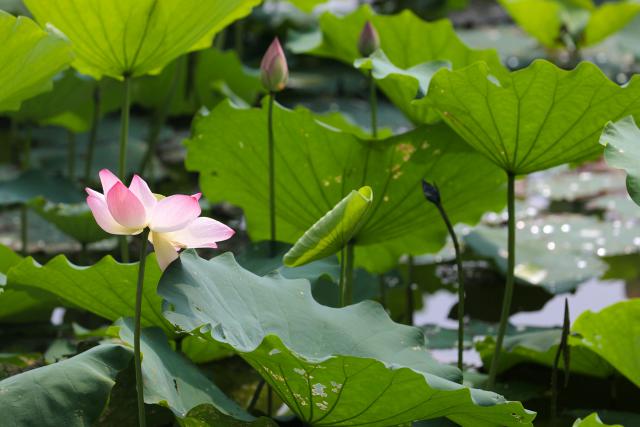 ▲公園內(nèi)主要荷花品種有粉色的"紅建蓮"和白色的"一丈青","紅建蓮"已大量盛開(kāi)。
