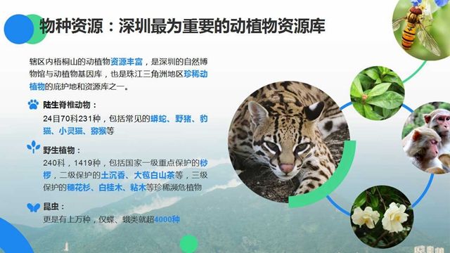 轄區(qū)內(nèi)梧桐山的動植物資源豐富,是深圳的自然博物館與動植物基因庫,也是珠江三角洲地區(qū)珍稀動植物的庇護地和資源庫之一。經(jīng)調(diào)查統(tǒng)計,有24目70科231種,包括常見的蟒蛇、野豬、豹貓、小靈貓、獼猴等;野生植物240科,1419種,包括國家一級重點保護的桫欏,二級保護的土沉香、大苞白山茶等,三級保護的穗花杉、白桂木、粘木等珍稀瀕危植物;昆蟲更是有上萬種,僅蝶、蛾類就超4000種。
