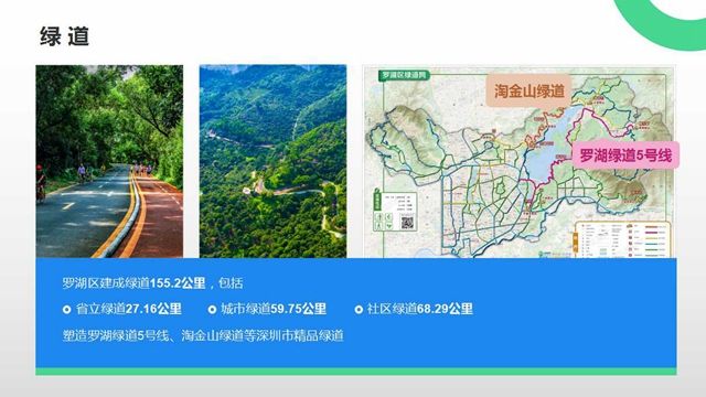 羅湖區(qū)建成綠道155.2公里,包括省立綠道、城市綠道、社區(qū)綠道等,塑造了羅湖綠道5號線、淘金山綠道等深圳市精品綠道。羅湖綠道5號線是融山水、休閑、生態(tài)和文化于一體的特色精品綠道,全線共分為山水休閑線、果林野趣線、河濱沁爽線三段,依山傍水而建,有效融合沿線自然景觀和人文景觀,把城市生活引入山水美景,使自然風光更加貼近市民生活,形成“一路山水、一路文化”、獨具羅湖特色的風景線。被市民譽為“深圳最美綠道”。