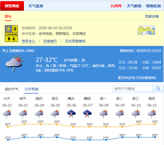 今天白天仍有雷陣雨,雨天路滑,視線差,行車注意交通安全。中午前后天氣天氣悶熱,或有短時雷陣雨,出門記得攜帶雨傘,遮陽又擋雨。