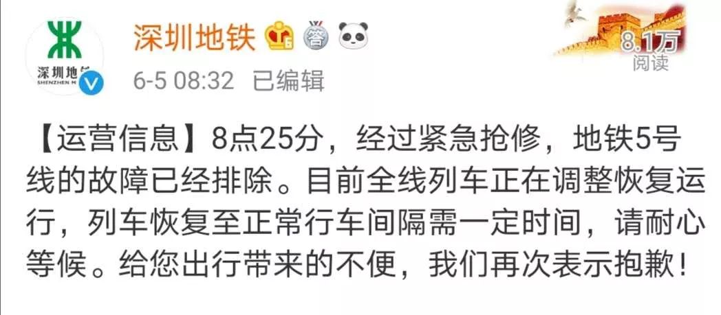 @深圳地鐵發(fā)布信息:8點25分,經(jīng)過緊急搶修地鐵5號線的故障已經(jīng)排除。目前全線列車正在調(diào)整恢復(fù)運行。