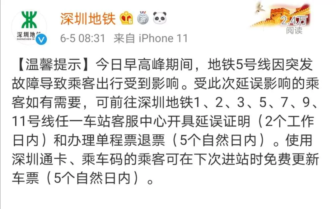 隨后,深圳地鐵官方微博發(fā)布溫馨提示,今日(6月5日)早高峰期間,地鐵5號線因突發(fā)故障導(dǎo)致乘客出行受到影響。受此次延誤影響的乘客如有需要,可前往深圳地鐵1、2、3、5、7、9、11號線任一車站客服中心開具延誤證明(2個工作日內(nèi))和辦理單程票退票(5個自然日內(nèi))。使用深圳通卡、乘車碼的乘客可在下次進站時免費更新車票(5個自然日內(nèi))。