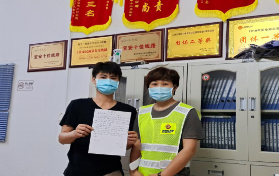 見(jiàn)圳客戶端·深圳新聞網(wǎng)2020年6月9日訊(深圳特區(qū)報(bào)記者 徐興東)6月9日早上,一位自稱(chēng)劉先生的年輕人冒著滂沱大雨來(lái)到了西部公汽寶永車(chē)隊(duì)。一進(jìn)辦公室,劉先生雙手捧著將親筆寫(xiě)的一封感謝信呈給了隊(duì)助張喜鳳,并深有感觸地說(shuō)道:“多災(zāi)多難的父親有幸遇到乘務(wù)員鄭錄蓮的熱心幫助,并想方設(shè)法聯(lián)系上我。謝謝你們的成全,才讓我在父親節(jié)即將到來(lái)之時(shí)還能叫一聲爸爸,我將終生銘記諸位的大恩大德!”樸實(shí)無(wú)華的話語(yǔ),感染了在場(chǎng)的每一個(gè)人,分明看出個(gè)個(gè)眼里都閃爍著晶瑩的喜悅淚花。