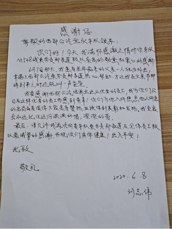 6月9日早上,一位自稱(chēng)劉先生的年輕人冒著滂沱大雨來(lái)到了西部公汽寶永車(chē)隊(duì)。一進(jìn)辦公室,劉先生雙手捧著將親筆寫(xiě)的一封感謝信呈給了隊(duì)助張喜鳳。