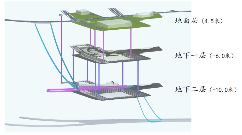 建議地下一層作為人行層和與地鐵銜接的交通樞紐層,地下二層作為主要交通層;在地下二層設(shè)置交通環(huán)島,實現(xiàn)地下空間與望海路地下快速路連接。