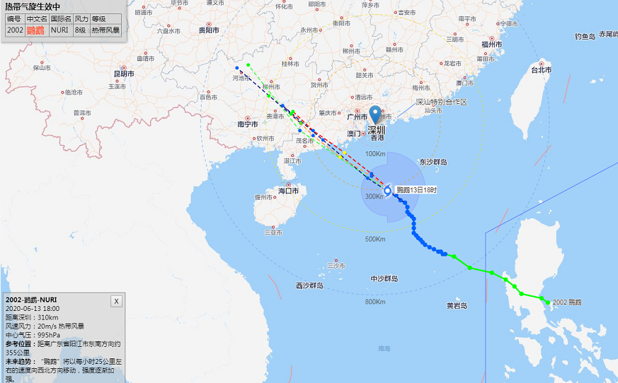 6月13日12時臺風(fēng)“鸚鵡”(熱帶風(fēng)暴級)位于深圳市東南方大約446公里的海面上,中心附近最大風(fēng)力8級。未來24小時趨向江門至茂名附近海域,最大可能在陽江附近登陸。我市13日17時前后起風(fēng)力逐漸加大,13日夜間至14日上午為風(fēng)雨主要影響時段。目前臺風(fēng)藍(lán)色預(yù)警信號生效中。深圳市氣象臺2020年06月13日12時35分發(fā)布。