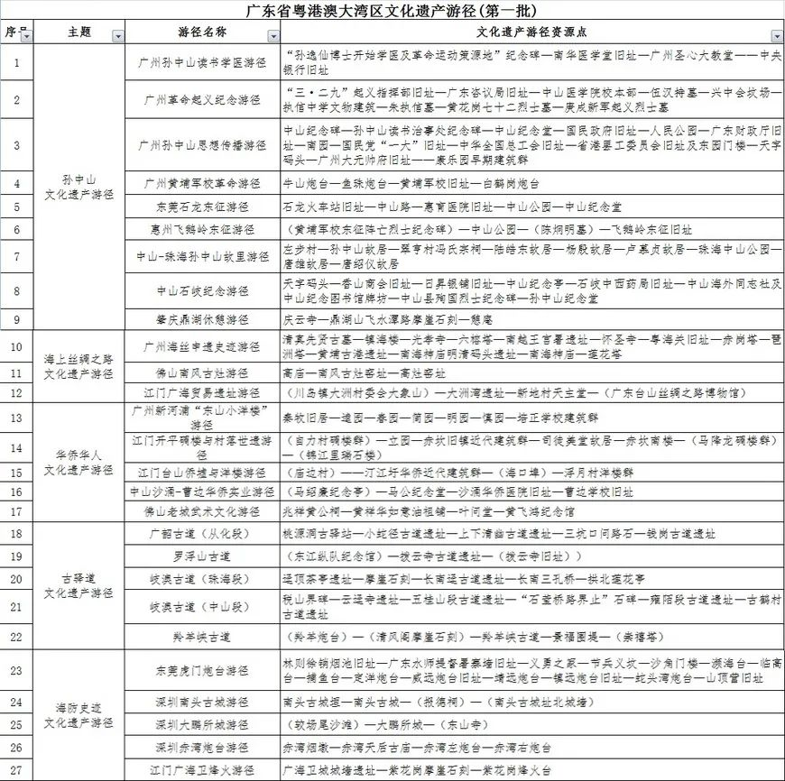 ⑦13日,首批粵港澳大灣區(qū)文化遺產(chǎn)游徑發(fā)布,包含孫中山文化遺產(chǎn)游徑、海上絲綢之路文化遺產(chǎn)游徑、華僑華人文化遺產(chǎn)游徑、古驛道文化遺產(chǎn)游徑和海防史跡文化遺產(chǎn)游徑五大主題共27段實(shí)體游徑。其中,海防史跡文化遺產(chǎn)游徑主要分布于東莞、深圳,包括深圳南頭古城游徑、大鵬所城游徑、赤灣炮臺(tái)游徑等。