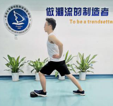 站姿拉伸,弓步站位,拉伸腳的腳掌踩在合適高度的墊片上,后半腳掌落地,雙手置于腰間保持平衡;身體前傾用力,保持30秒-60秒/次×3-5組。