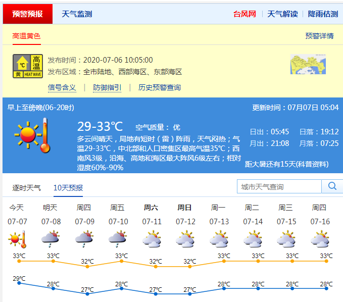 根據(jù)深圳市氣象臺(tái)預(yù)測(cè),7月7日多云間晴天,局地有短時(shí)(雷)陣雨,天氣悶熱,最高氣溫33-35℃,高溫黃色預(yù)警信號(hào)生效中。8日持續(xù)悶熱,有局地短時(shí)(雷)陣雨,易出現(xiàn)在早晨和午后;9-10日(學(xué)業(yè)考)天氣悶熱,有雷陣雨,部分時(shí)間雨勢(shì)較大,最高氣溫32-33℃。