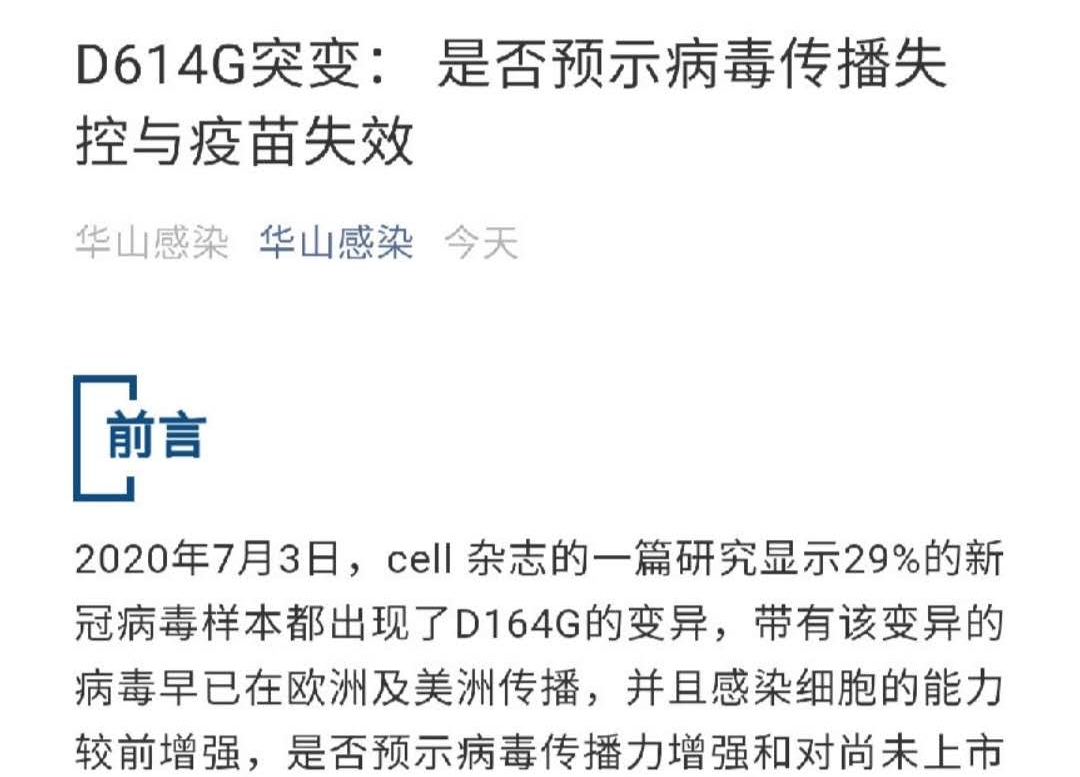 張文宏稱,特別是在7月3日,國(guó)際著名雜志《細(xì)胞》發(fā)表文章顯示,29%的新冠病毒樣本出現(xiàn)了D164G的變異,此次北京疫情反彈中發(fā)現(xiàn)的病毒株也有這個(gè)突變。