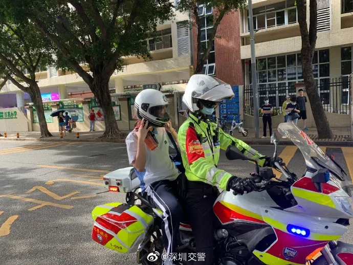 一考生遇早高峰擁堵,距離開考還有十分鐘,@深圳福田交警鐵騎搭載考生順利到達考場。