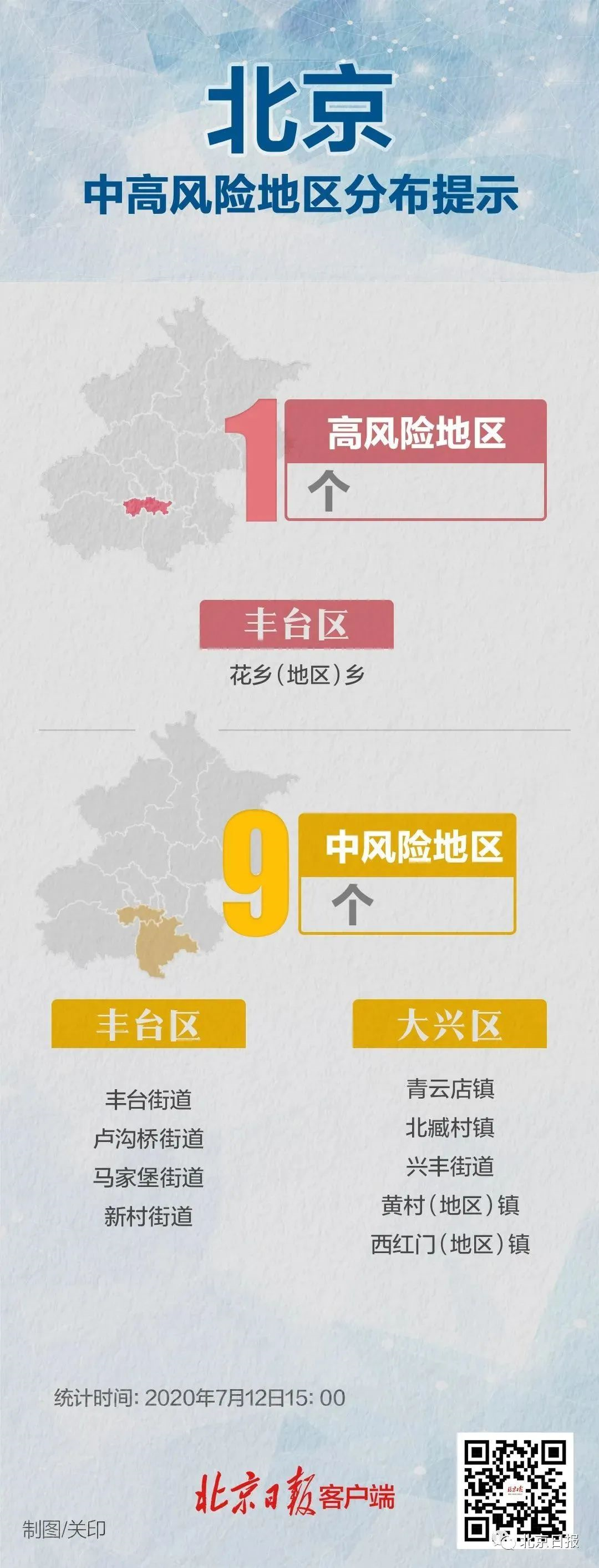 按照北京市向國家衛(wèi)生健康委報備的《常態(tài)化防控下北京市新冠肺炎疫情風(fēng)險分區(qū)分級標(biāo)準(zhǔn)》,經(jīng)評估,豐臺區(qū)盧溝橋(地區(qū))鄉(xiāng)、大興區(qū)魏善莊鎮(zhèn)、大興區(qū)高米店街道連續(xù)14天內(nèi)無新增本地確診病例,由中風(fēng)險地區(qū)調(diào)整為低風(fēng)險地區(qū)。