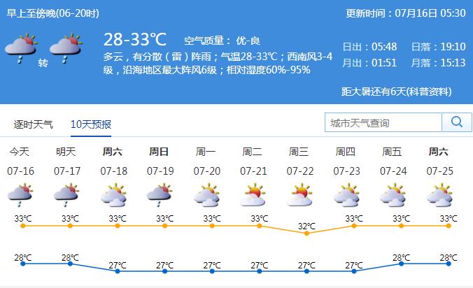 見圳客戶端·深圳新聞網(wǎng)2020年7月16日訊 未來一周天氣持續(xù)悶熱。16日多云間晴天,有分散(雷)陣雨;氣溫28-33℃,中北部地區(qū)最高氣溫35℃左右;西南風(fēng)3-4級,沿海、高地和海區(qū)最大陣風(fēng)6級;相對濕度55%-90%。17日多云,間中有分散(雷)陣雨;18-22日晴天間多云,局地偶有(雷)陣雨。