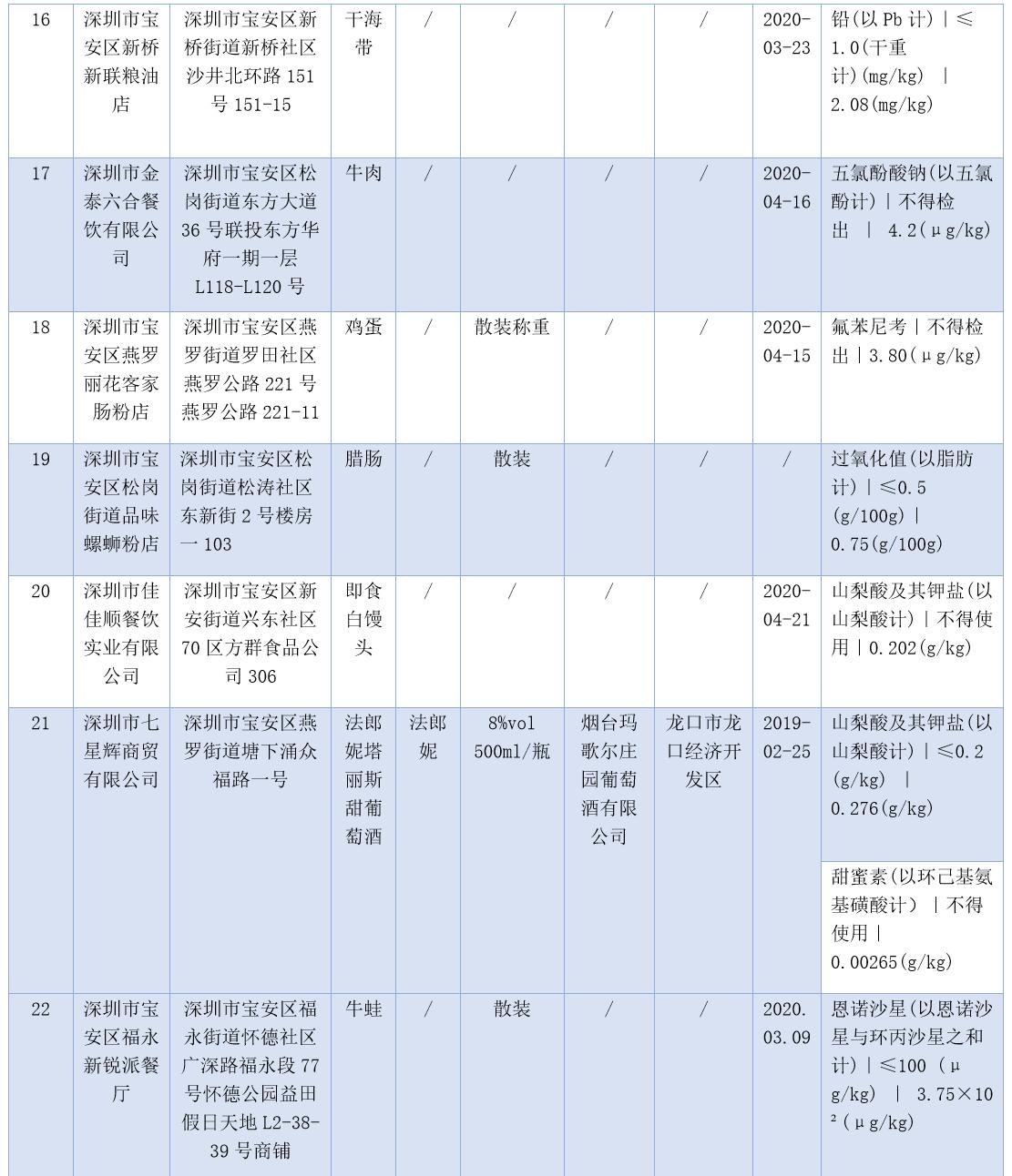 見圳客戶端·深圳新聞網(wǎng)2020年7月17日訊(晶報(bào)記者 鄧裴裴/制圖)7月17日,深圳市市場監(jiān)督管理局官網(wǎng)發(fā)布了2020年第二十二期食品安全抽樣檢驗(yàn)情況通報(bào),3-5月,共抽檢生產(chǎn)、流通、餐飲環(huán)節(jié)食品1229批次,發(fā)現(xiàn)不合格樣品47批次。記者注意到,不少不合格樣品抽檢單位為餐飲店,包括皇軒酒店、窯雞王、愛上牛蛙、御可奶茶等,還有些小吃店、腸粉店、螺獅粉店紛紛上榜。涉及不合格項(xiàng)目類別包括農(nóng)藥殘留、獸藥殘留、食品添加劑、微生物污染、品質(zhì)指標(biāo)、金屬等元素污染物。