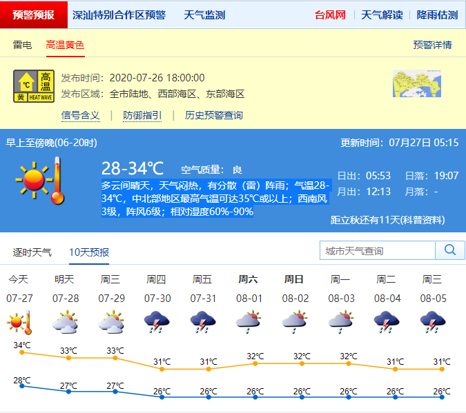深圳7月27日白天多云間晴天,天氣悶熱,有分散(雷)陣雨;氣溫28-34℃,中北部地區(qū)最高氣溫可達35℃或以上;西南風3級,陣風6級;相對濕度60%-90%。