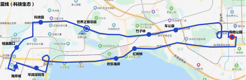 停靠站點:世界之窗總站→竹子林→車公廟→購物公園→紅樹林→歡樂海岸→華潤深圳灣→海岸城→深大-騰訊站→科技園→世界之窗總站