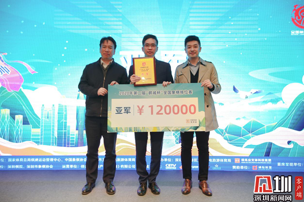 薛江與舒立共同為趙鑫鑫頒發(fā)獎(jiǎng)牌與賽事獎(jiǎng)金。趙鑫鑫在發(fā)表賽后感言時(shí)說道,今年疫情的大背景下賽事少,“鵬城杯”辦得非常好。他也表示,在一年的最后一天下棋對(duì)弈非常難得,希望明年再進(jìn)一步。