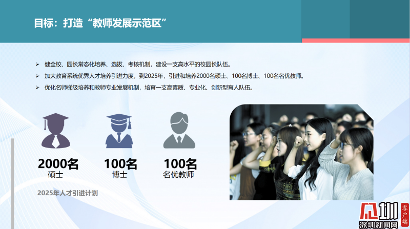 在人才隊伍方面,實施“領鷹工程”,建設一支高水平的校園長隊伍。優(yōu)化名師梯級培養(yǎng)和教師專業(yè)發(fā)展機制,培育一支高素質(zhì)、專業(yè)化、創(chuàng)新型育人隊伍。到2025年,羅湖將引進和培養(yǎng)2000名碩士、100名博士、100名名優(yōu)教師,建立教科研博士工作站。