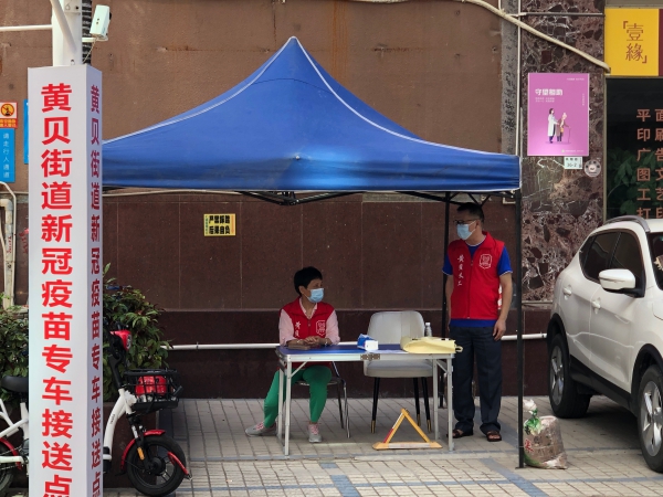 炎炎烈日,為貼心服務(wù)群眾,黃貝街道設(shè)立了接種新冠疫苗專車接送點。接送點的義工告訴記者,在戶外工作特別消耗水,一個上午就喝掉四五瓶飲用水,雖然準備了防曬的雨棚,但路上的熱空氣卻躲不掉,一會兒下來也是大汗淋漓,不過能為群眾服務(wù),盡快建立全民免疫陣線,這份守候很值得。
