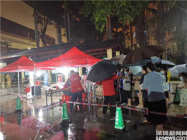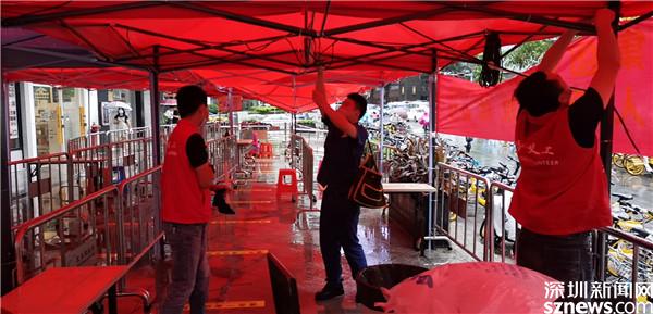 桂園街道防疫一線工作人員冒著高溫和大雨,全力保障轄區(qū)居民生命健康安全 。