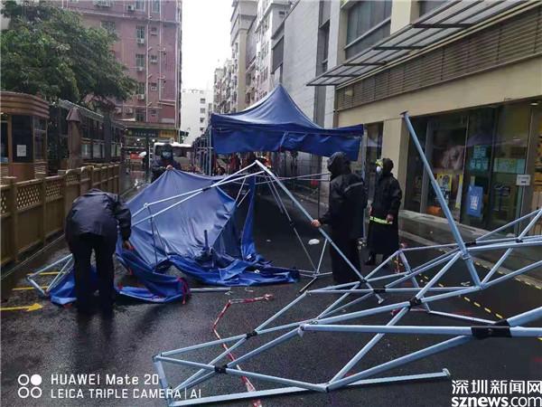 6月22日早上,黃貝街道工作人員在風(fēng)雨中搭建核酸檢測點(diǎn)帳篷。
