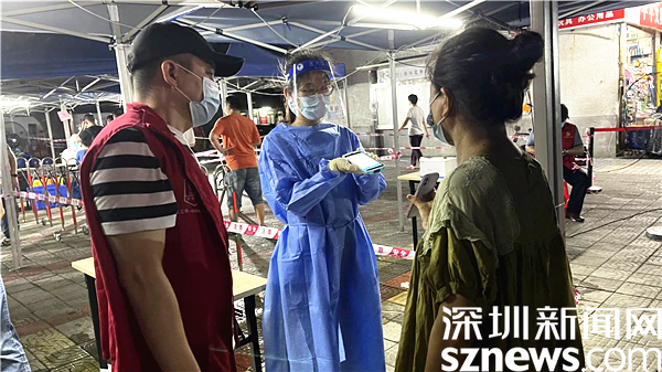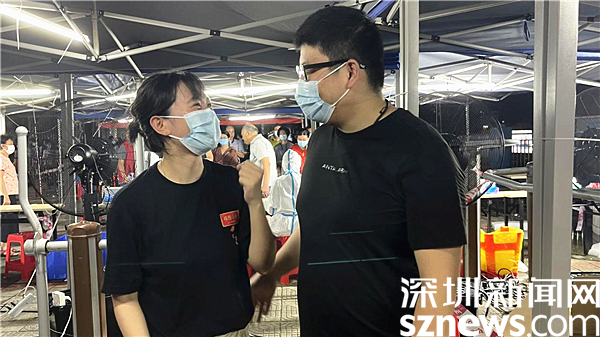 6月20日下午,在深圳市羅湖區(qū)東湖街道布心花園的核酸檢測(cè)點(diǎn),正緊鑼密鼓地進(jìn)行核酸檢測(cè)。李忠麗是醫(yī)護(hù)人員隊(duì)伍中的一員,由于高溫暑熱,又處在高強(qiáng)度的工作下,李忠麗突然感覺(jué)身體不適、呼吸困難、頭暈?zāi)垦?。任雨則在第一時(shí)間發(fā)現(xiàn)李忠麗身體有恙,上前查看其身體狀況并詢問(wèn)情況。“哪里不舒服?感覺(jué)怎么樣?”任雨心急如焚地問(wèn)道。李忠麗虛弱得答不上話,立即被扶至一旁進(jìn)行休息,并服用了兩瓶藿香正氣水。經(jīng)過(guò)一段時(shí)間的休息,李忠麗的身體狀況得到了緩解。
