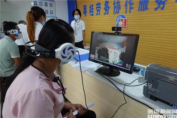 在粵桂勞務(wù)協(xié)作服務(wù)中心,一場兩地遠(yuǎn)程視頻招聘會正在舉行,不少百姓拿著心儀的崗位介紹在等候面試。服務(wù)中心前臺放置著四臺電腦,參加面試的人坐在電腦前連接視頻,視頻的另一端,是來自羅湖區(qū)的企業(yè)。這樣的視頻招聘會,定期在服務(wù)中心舉行。