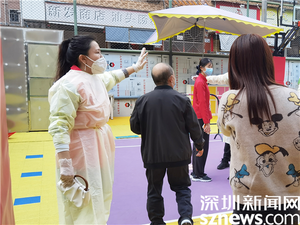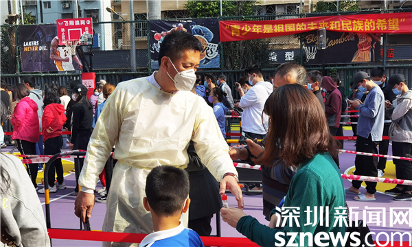 羅湖區(qū)審計局黨組書記黃吉南在新村社區(qū)防疫現(xiàn)場指導核酸檢測流程。