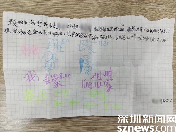 “親愛的lín dǎo您好……我媽媽在您那工作,這些天都沒能陪我,請你讓她6點(diǎn)30分下班可以嗎?”,1月13日,羅湖區(qū)南湖街道羅湖社區(qū)黨委書記姜德榮收到了一封特別的來信。這封信來自社區(qū)工作人員彭女士可愛的女兒,信上的內(nèi)容圖文并茂,表達(dá)了一個(gè)10歲小女孩的小心愿,希望媽媽可以早點(diǎn)下班,回家陪她。