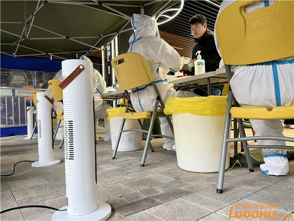 十分鐘后,物資配送車輛來(lái)到萬(wàn)科里核酸檢測(cè)點(diǎn),工作人員將熱乎乎的姜茶送到工作人員手中,并熟練地尋找合適的地方架起暖風(fēng)機(jī)?!皬闹苣┑呐瘜殞?,到今天的暖風(fēng)機(jī),暖心行動(dòng)一再升級(jí),感覺(jué)很驚喜?!绷_湖醫(yī)院護(hù)士劉新媚向記者說(shuō)道,目前疫情防控工作任務(wù)艱巨,檢測(cè)點(diǎn)周末也在連續(xù)運(yùn)轉(zhuǎn),但街道及時(shí)的物資保障,讓所有一線人員都感覺(jué)很暖心。