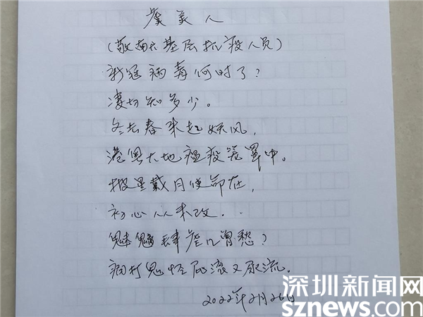 他在《虞美人》寫道:新冠病毒何時了?凄切知多少,冬去春來起妖風(fēng),港粵大地瘟疫籠罩中。披星戴月使命在,初心從未改,魅魑肆虐幾曾愁?痛打鬼怪屁滾又尿流。