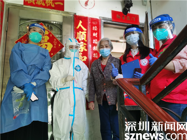 社工帶領(lǐng)醫(yī)護(hù)人員為高齡長者上門進(jìn)行核酸檢測。