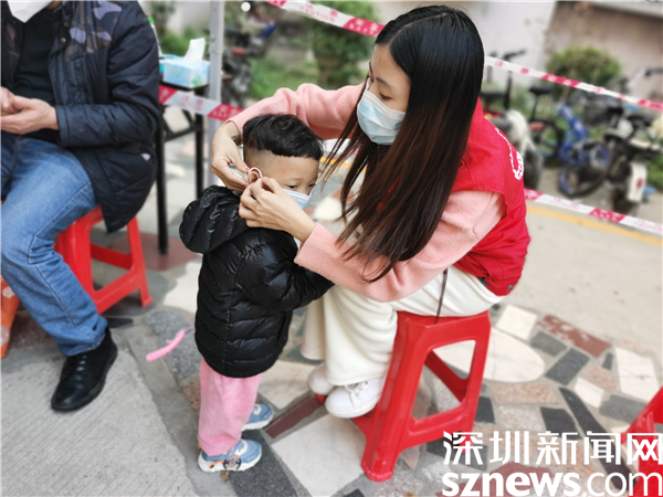 社工在核酸現(xiàn)場為沒有佩戴口罩的小朋友佩戴口罩。