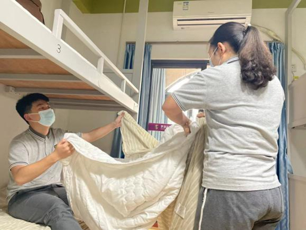 測溫、登記,回到闊別已久的宿舍,住宿的學(xué)生與宿管老師一起整理內(nèi)務(wù),共同打理學(xué)生在校園里的“小家”。