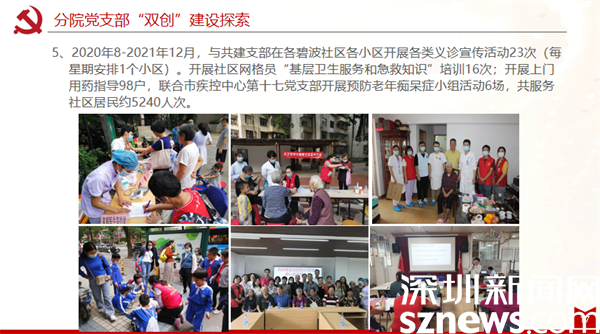 區(qū)中醫(yī)院康復(fù)分院黨支部以黨建引領(lǐng)“雙創(chuàng)”工作取得良好實(shí)效,與黃貝社區(qū)黨委的共建和交叉任職推動(dòng)醫(yī)療資源和社區(qū)服務(wù)的資源共享,把“社區(qū)關(guān)愛(ài)服務(wù)”落到實(shí)處。通過(guò)黨組織聯(lián)動(dòng),增強(qiáng)了居民與醫(yī)護(hù)之間的溝通聯(lián)系,有力推動(dòng)65歲老人體檢和疫苗接種,大大提升居民認(rèn)可度、滿意度。康復(fù)分院黨支部與社區(qū)黨支部和黨員義工合作,為轄區(qū)內(nèi)70歲以上生活不便孤寡老人提供全方位的關(guān)愛(ài)服務(wù),開(kāi)展上門(mén)訪視服務(wù)535人次;深入各小區(qū)開(kāi)展各類(lèi)義診宣傳、健康知識(shí)推廣活動(dòng)等36場(chǎng),惠及居民5000余人。