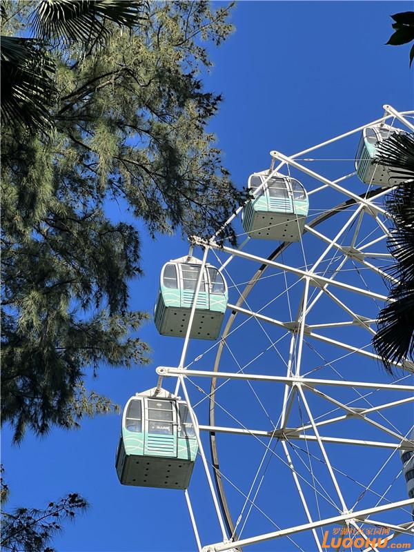 摩天輪藏在藍天綠樹間,顯得格外浪漫。