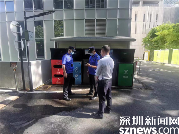 執(zhí)法員檢查垃圾分類投放點(diǎn)。