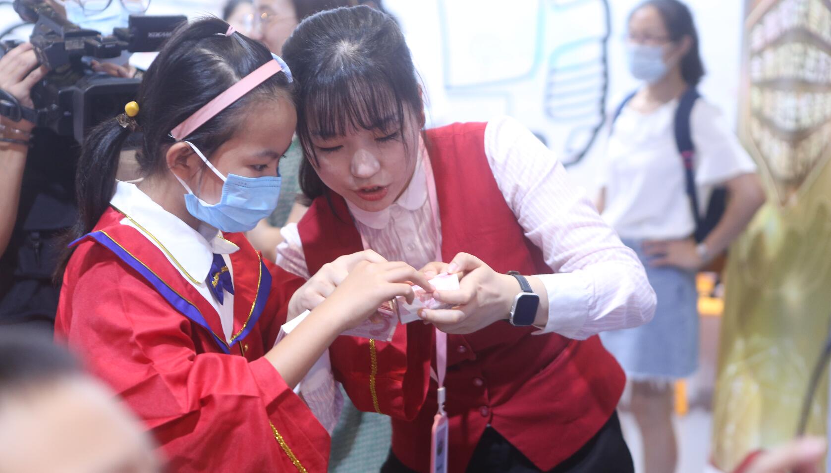 華夏銀行金牌點鈔手老師細(xì)心教導(dǎo)小飛俠們現(xiàn)場點鈔