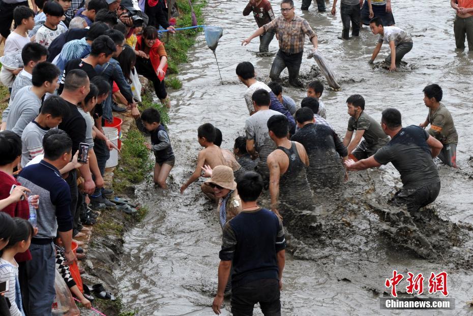 3月17日,福建省龍巖市連城縣莒溪鎮(zhèn)璧洲古村落內(nèi),一場“抓魚鬧春田”的活動吸引了許多市民前來參與。圖為民眾在泥塘的渾水中抓魚。中新社記者 張斌 攝