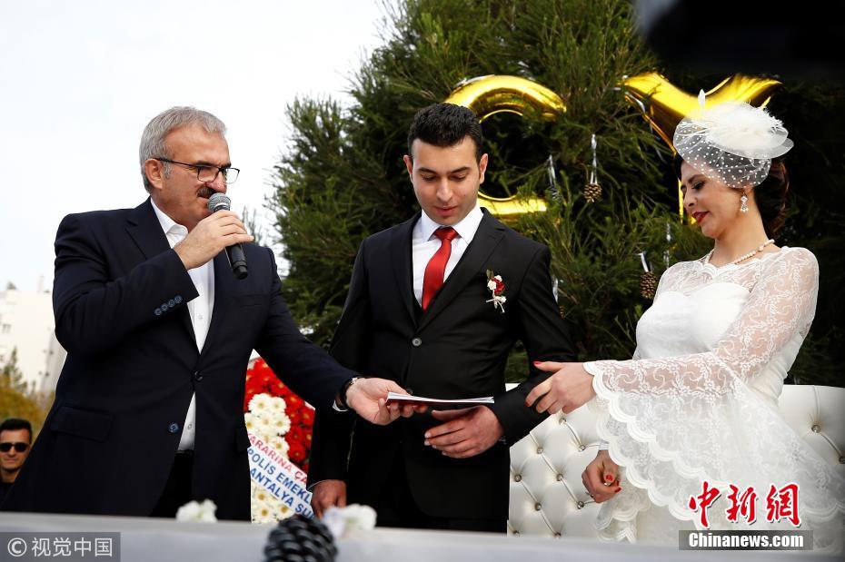 當?shù)貢r間2018年3月21日,土耳其安塔利亞,警官Ceren Ekici和Taha YasinGul舉行婚禮。在10個月前的一次行動中,Taha YasinGul不慎開槍擊中Ceren Ekici的頭部,所幸沒有造成生命危險。他們的婚禮由警局同事操辦,同事們舉著防彈盾牌,護送這對新人走向禮臺。圖片來源:視覺中國