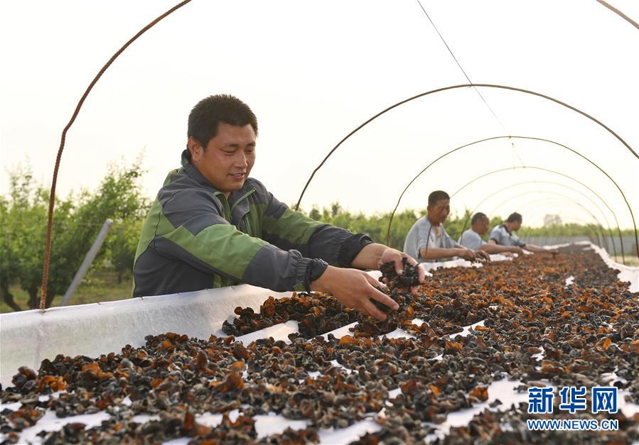 5月20日,河北省辛集市田家莊鄉(xiāng)東張口村農(nóng)民在晾曬采收的木耳。