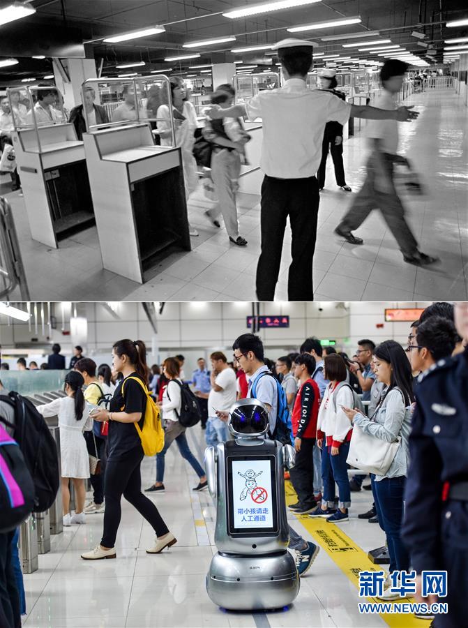 拼版照片:上圖為旅客經(jīng)過深圳羅湖口岸(資料照片,新華社記者陳小波攝);下圖為2018年4月6日,在深圳灣口岸出境大廳,機(jī)器人在自助查驗(yàn)通道前對旅客進(jìn)行提示(新華社記者毛思倩攝)。新華社發(fā)
