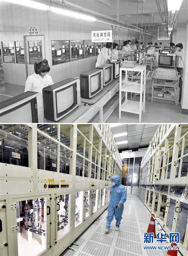 拼版照片:上圖為工人在深圳華利電子有限公司彩色電視機(jī)生產(chǎn)線工作(資料照片,新華社記者李長永攝);下圖為2018年6月13日,工作人員在柔宇科技首條類六代全柔性顯示屏大規(guī)模量產(chǎn)線巡檢設(shè)備狀態(tài)(新華社記者毛思倩攝)。新華社發(fā)