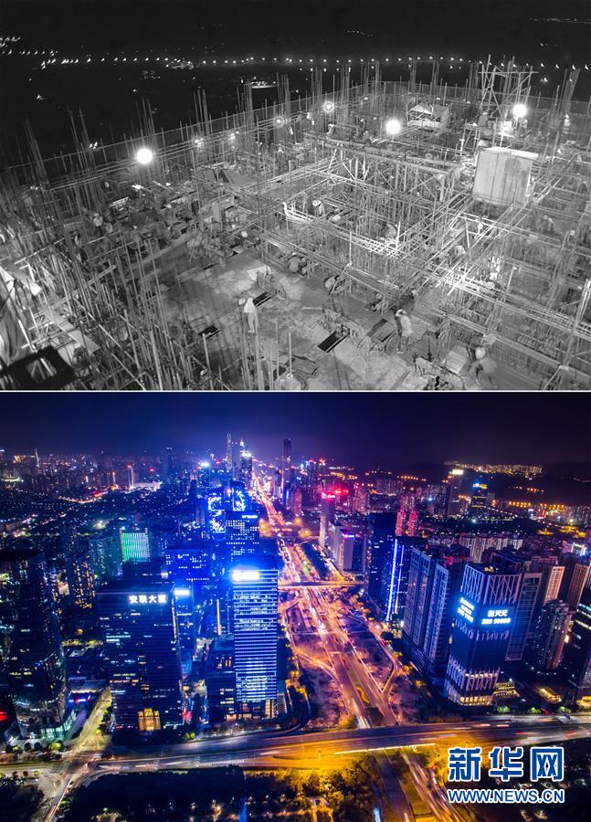 拼版照片:上圖為建筑工人在深圳國(guó)際貿(mào)易中心大廈工地工作(資料照片,新華社記者陳學(xué)思攝);下圖為2017年2月14日無(wú)人機(jī)拍攝的深圳夜景(新華社記者毛思倩攝)。新華社發(fā)