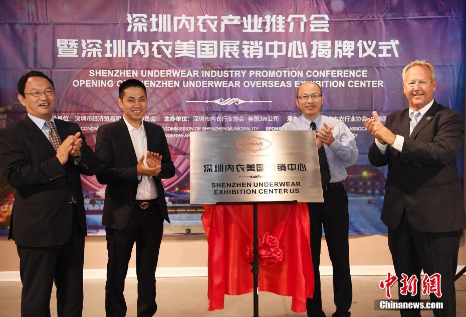 當(dāng)?shù)貢r(shí)間7月17日,深圳市內(nèi)衣行業(yè)協(xié)會(huì)在中美國(guó)際(美東)創(chuàng)業(yè)港——默特爾比奇市Waccoma Center舉行深圳內(nèi)衣產(chǎn)業(yè)推介會(huì)暨深圳內(nèi)衣美國(guó)展銷中心揭牌儀式。中美國(guó)際(美東)創(chuàng)業(yè)港聯(lián)合深圳市內(nèi)衣行業(yè)協(xié)會(huì)為深圳內(nèi)衣品牌進(jìn)駐美東市場(chǎng)搭建綠色通道和產(chǎn)業(yè)孵化平臺(tái),采用“時(shí)尚秀+靜態(tài)展”的形式,促進(jìn)中美內(nèi)衣文化和時(shí)尚的交流。圖為霍里郡議會(huì)主席馬克先生Mark Lazrus(右一)、深圳市經(jīng)濟(jì)貿(mào)易和信息化委員會(huì)副主任高林(左一)、美國(guó)3W公司董事長(zhǎng)王為工(右二)、深圳市內(nèi)衣行業(yè)協(xié)會(huì)常務(wù)副會(huì)長(zhǎng)兼秘書長(zhǎng)張峰偉(左二)出席揭牌儀式。中新社記者 陳文 攝