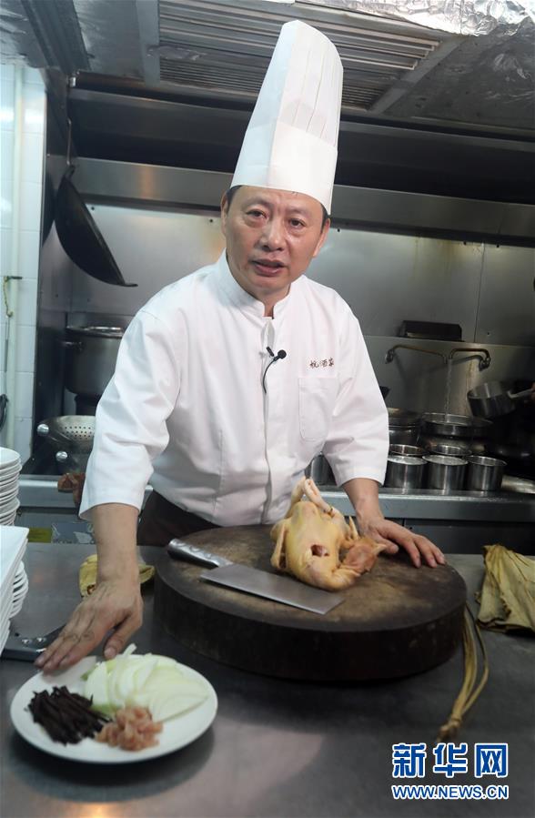 杭州酒家老板吳瑞康向記者介紹“叫化雞”的制作工序(6月16日攝)。 金庸在武俠小說《神雕俠侶》中借郭靖之口說過: “為國為民,俠之大者?!蔽鋫b精神在香港備受推崇,有其心向中華文化的情感基礎(chǔ)。在這個(gè)國際美食之都,品味舌尖上的武俠味,內(nèi)中的感覺別有深意。新華社記者 李鵬 攝