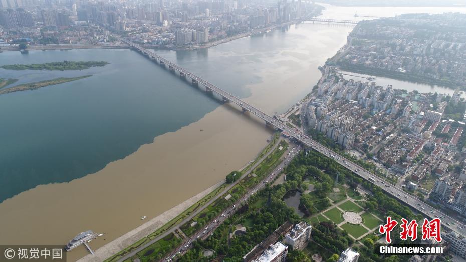 5月7日,湖北省襄陽(yáng)市,無(wú)人機(jī)航拍的漢江長(zhǎng)虹大橋處涇渭分明的漢江水面。強(qiáng)暴雨沖刷經(jīng)過(guò)去冬今春的田野地表積累的塵土,經(jīng)支流與主河道匯入時(shí),充滿污泥的洪水與主河道上清澈的丹江水形成難得一見的涇渭分明景觀。王虎攝 圖片來(lái)源:視覺中國(guó)